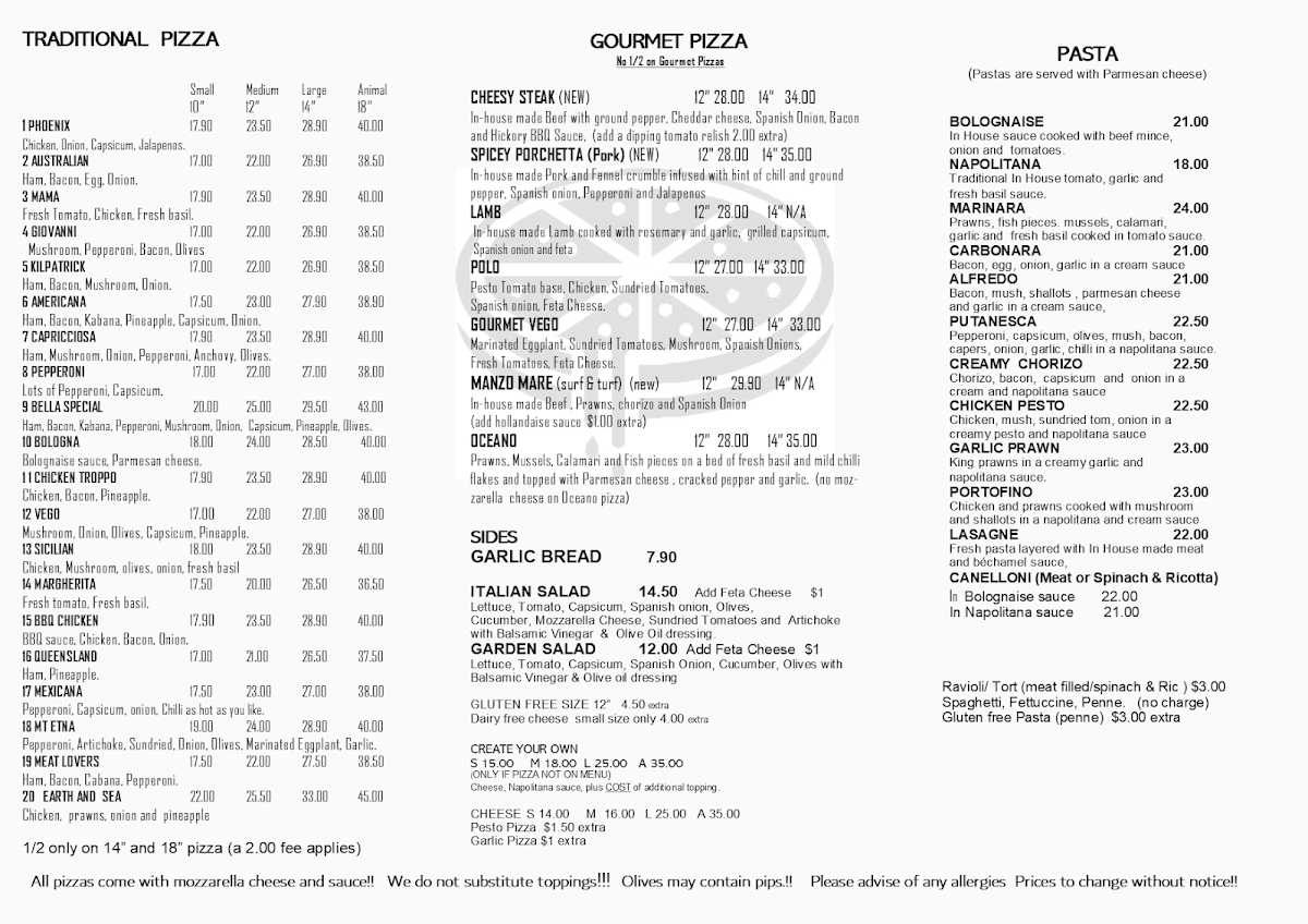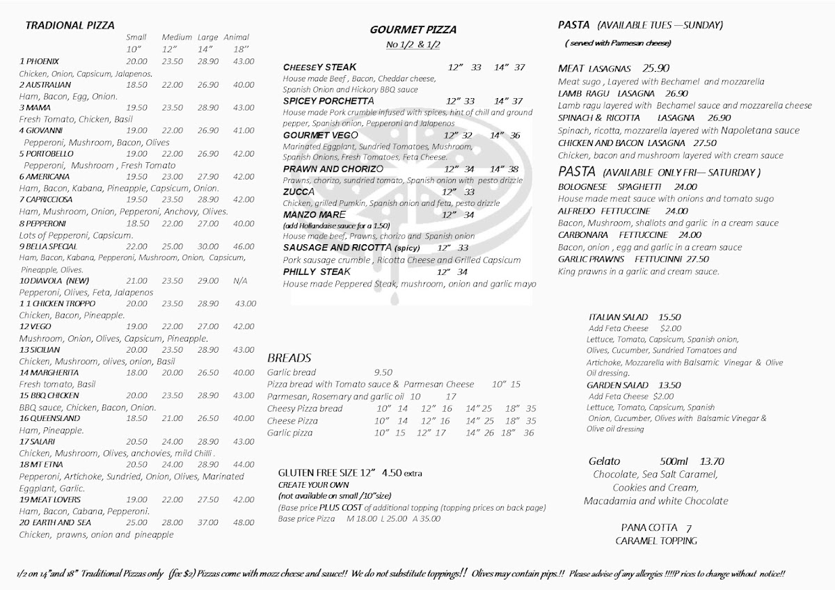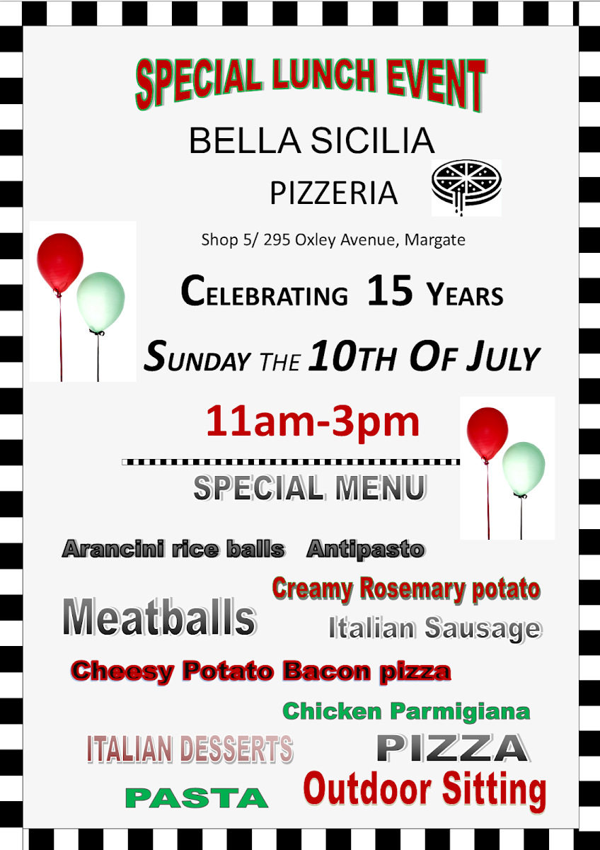 Bella Sicilia Pizza in Margate offers a diverse and enticing menu that caters to a variety of tastes. For drinks, they have refreshing options such as 1.25 L Soft Drinks and Canned Soft Drinks, perfect for quenching your thirst. Moving on to the pasta selection, their dishes include flavorful options like Garlic Prawn, Alla Crema, Bolognese Carbonara, and Putanesca. Each pasta promises a rich, satisfying experience with distinct flavors. As for pizzas, Bella Sicilia serves up traditional favorites including Meat Lovers Pizza (GF) for those craving a gluten-free option, BBQ Chicken Pizza (Lrg), Diavola Pizza (Med), and the comforting Mama Pizza (Med). For a lighter choice, the Vego Pizza (Lrg) is an excellent option for vegetarians. The range of pizzas and pastas, along with the variety of drinks, ensures there’s something for everyone, whether you're in the mood for hearty or lighter options. The menu combines both classic and creative dishes, making Bella Sicilia a go-to for a satisfying meal in Margate.